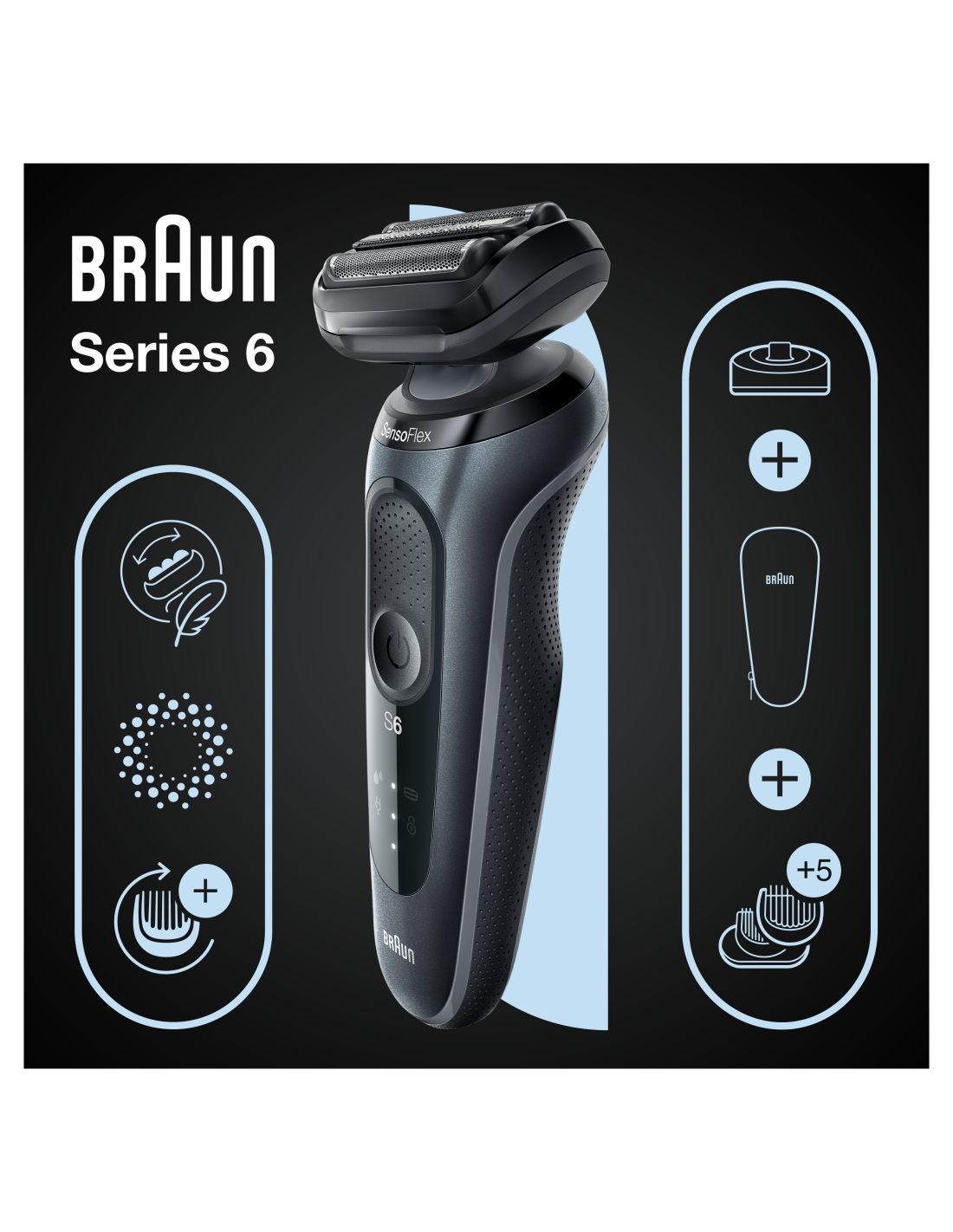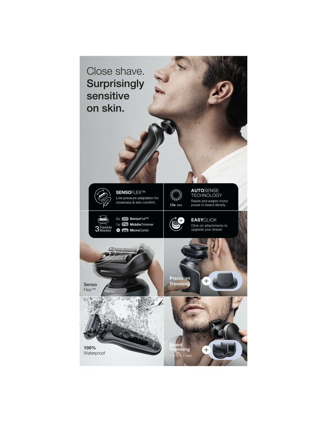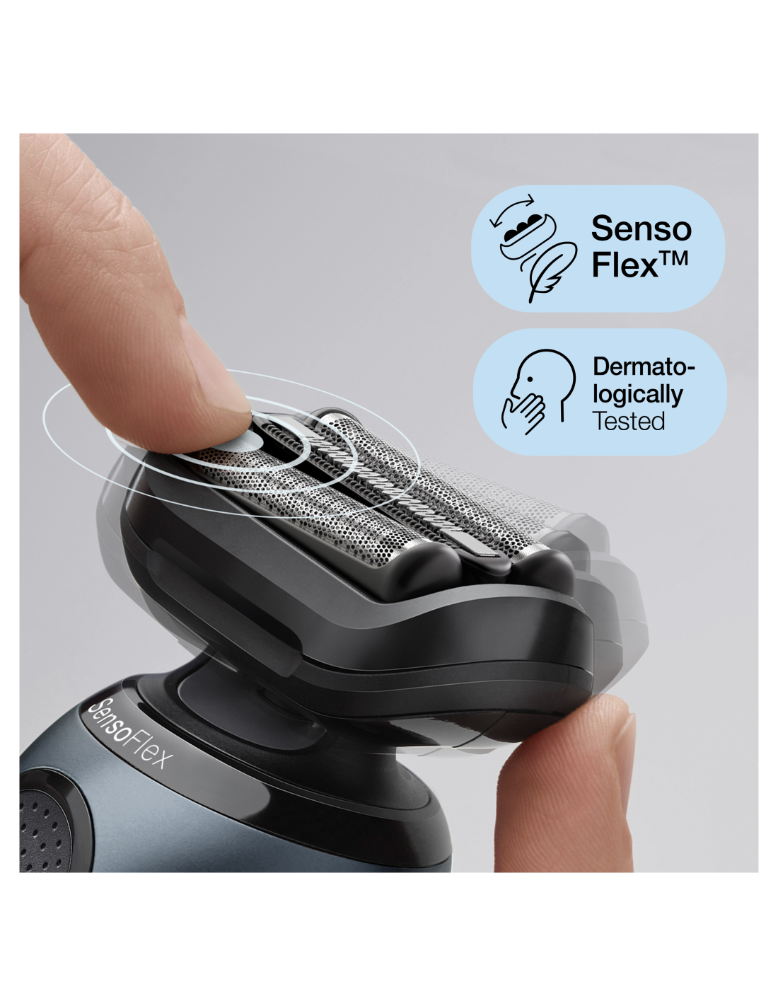 - Nahalähedasem ja nahale mugavam: dermatoloogiliselt katsetatud pöörlev pea SensoFlex ja SensoFoil-lõiketerad on disainitud nii, et tundlikule nahale avaldatakse võimalikult vähe survet.