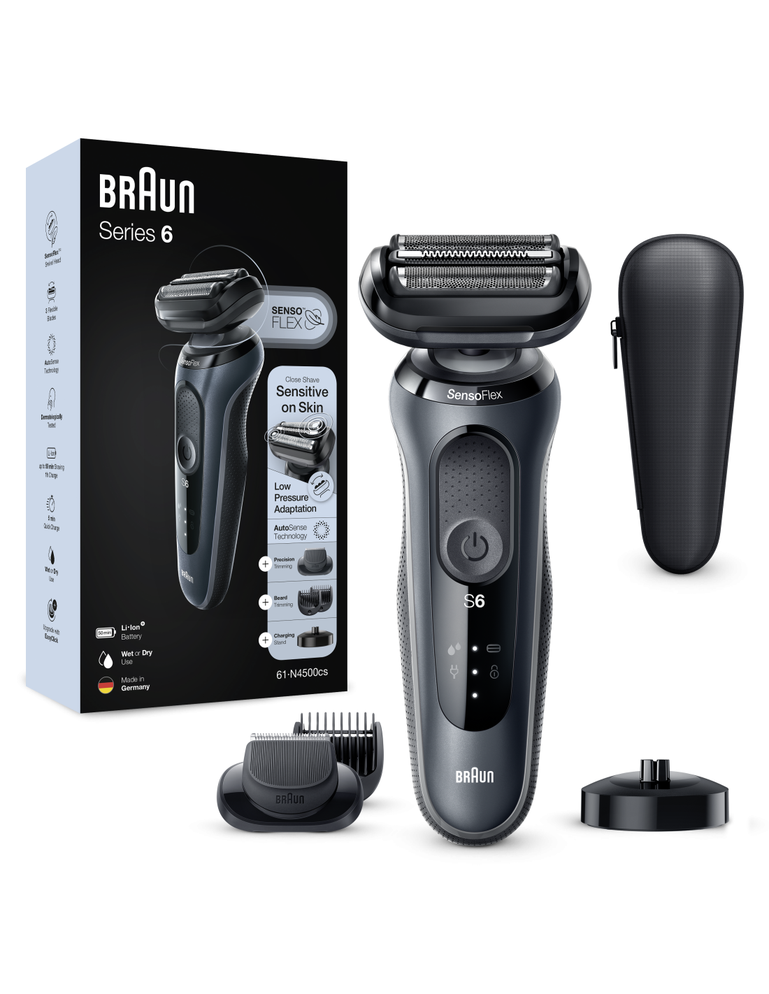 Braun Series 6 61-N4500cs elektripardel ja laadimisalus, habeme piiramistera, märg- ja kuivkasutus, laetav, juhtmeta võrguga pardel, hall