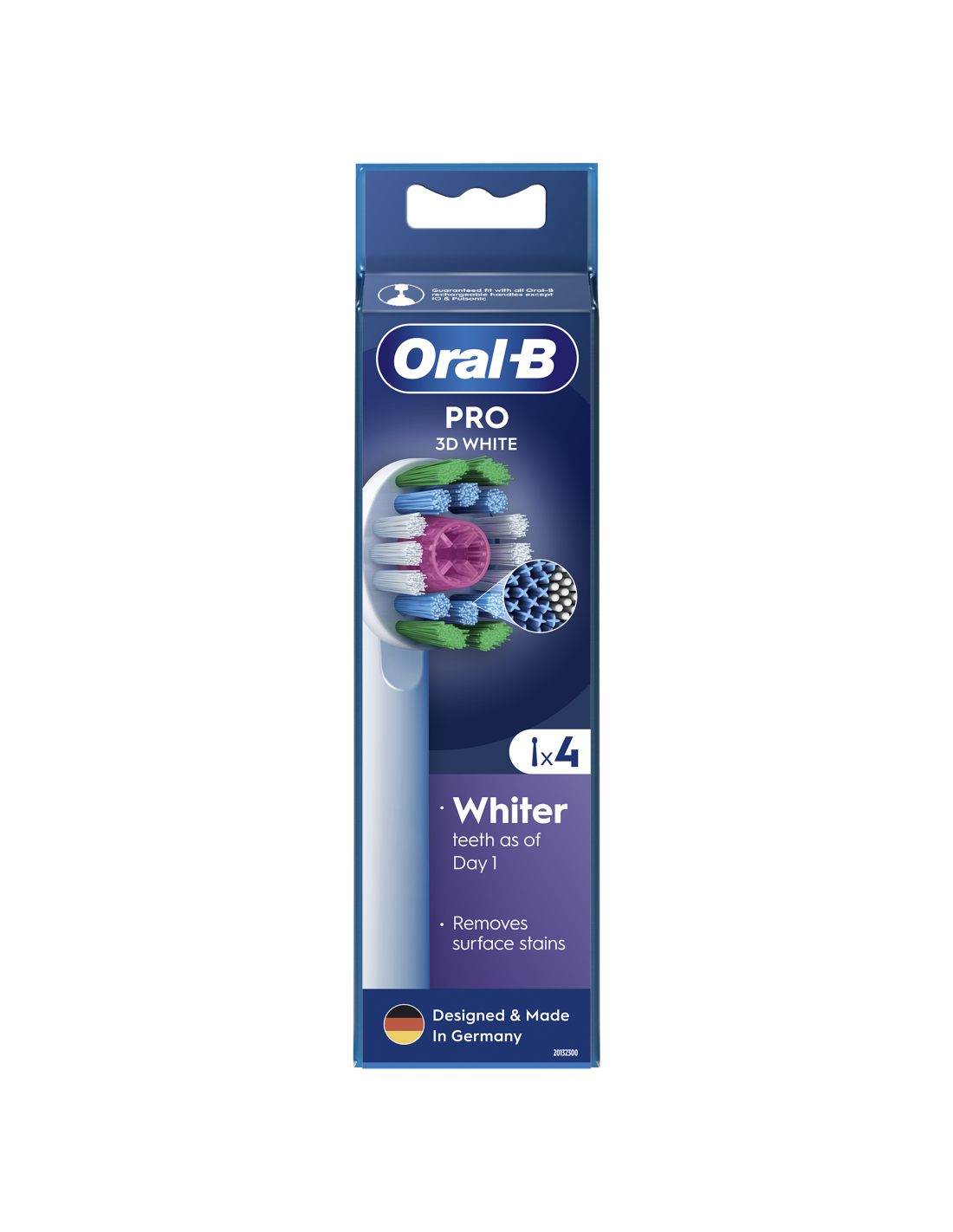 Oral-B 3D White hambaharjal on ainulaadne poleerimisotsik, mis valgendab hambaid juba esimesest päevast peale, eemaldades pindmised plekid. Oral-B originaalsed harjapead on disainitud uute X-kujuliste harjastega, mis puhastavad kohti, kuhu ümarad harjased ei ulatu. Selle harjapea kasutusindikaator muudab harjased rohelisest kollaseks, näidates, millal vahetada hambaharjapea 100% puhastustõhususe saavutamiseks. Garanteeritud ühilduvus kõigi Oral-B laetavate elektrihambaharjadega, välja arvatud Pulsonic & iO hambaharjad.