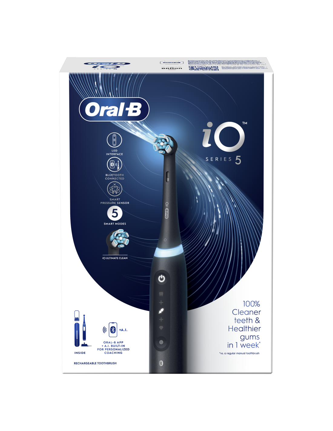 - „iO™“ – tai geriausia „Oral-B“ valymo technologija, kuri sujungia unikalią apvalią šepetėlio galvutę su švelniomis mikrovibracijomis, o naujoviška tiesinė magnetinė pavara sutelkia energiją būtent ten, kur jos labiausiai reikia – ties šerelių galiukais. Gaivus švaros pojūtis ir 100% sveikesnės dantenos vos per vieną savaitę.