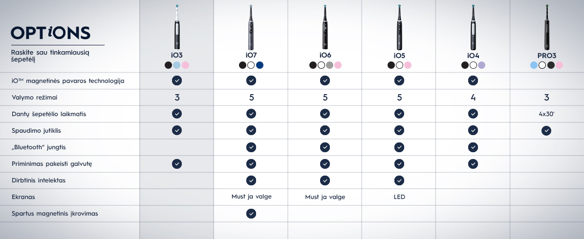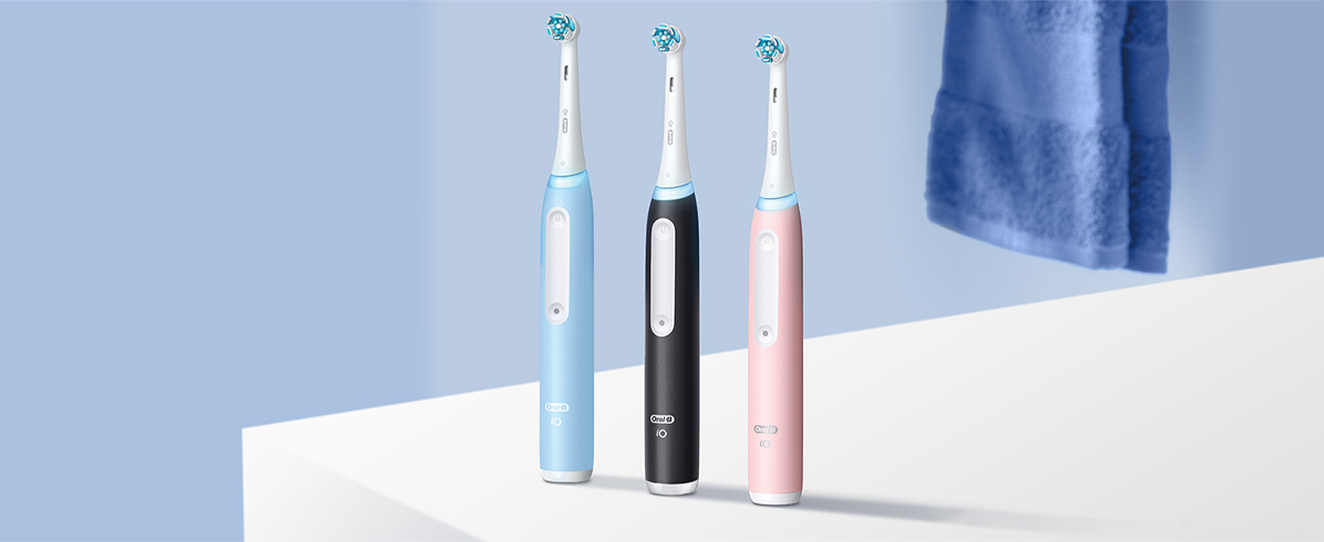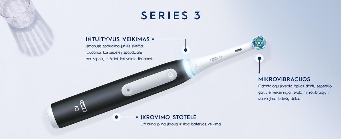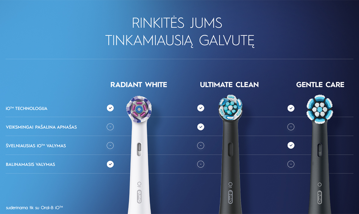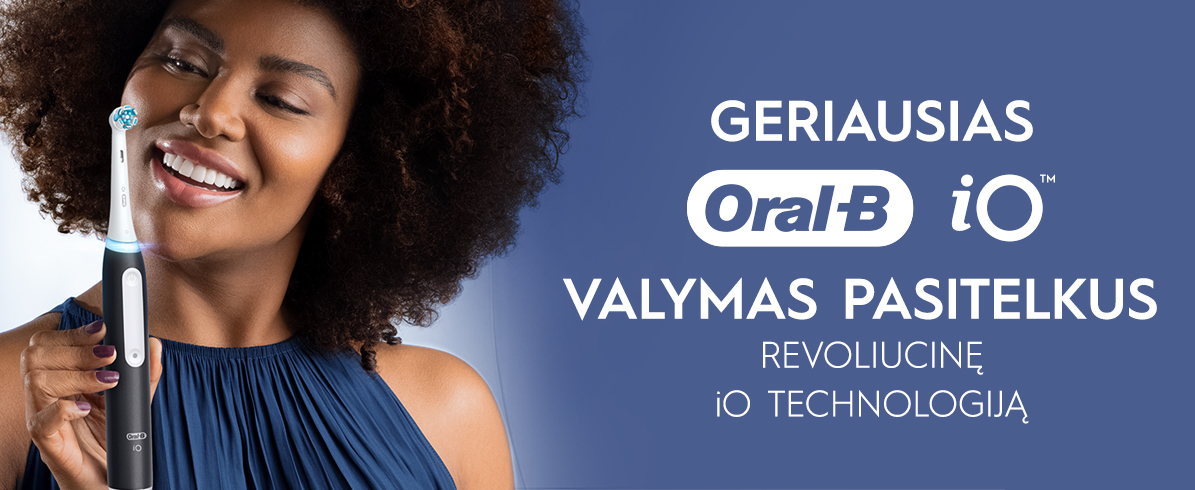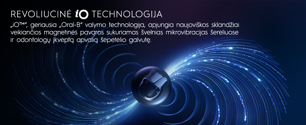 „iO™“, geriausia „Oral-B“ valymo technologija, apjungia naujoviškos sklandžiai veikiančios magnetinės pavaros sukuriamas švelnias mikrovibracijas šereliuose ir odontologų įkvėptą apvalią šepetėlio galvutę.