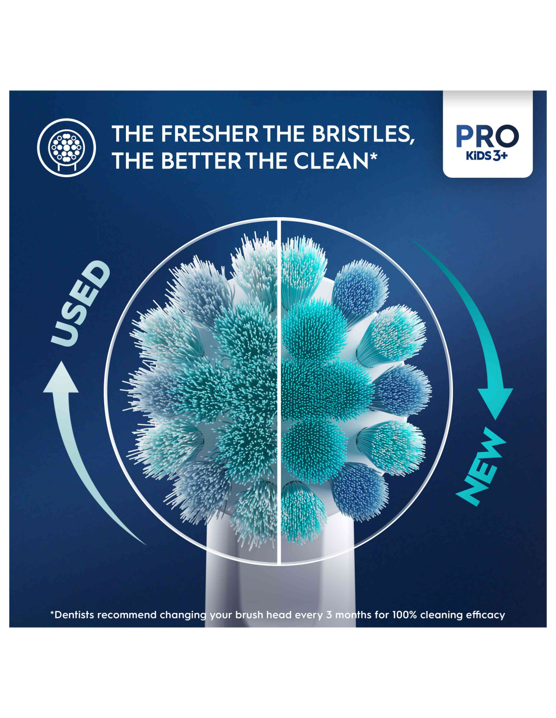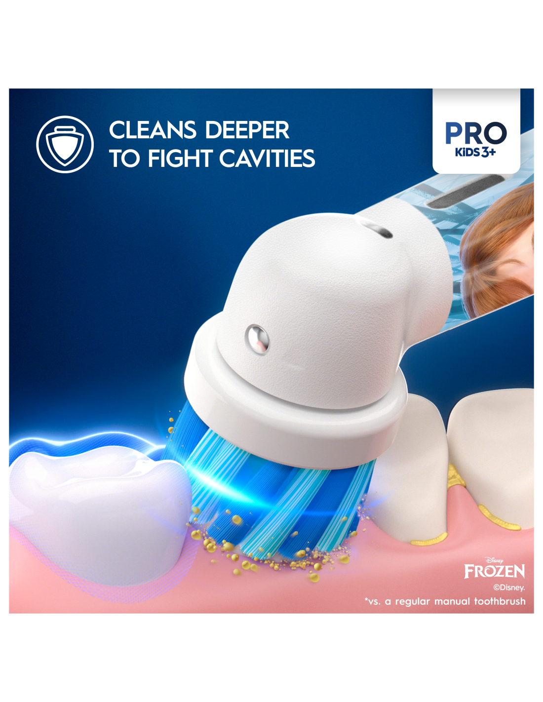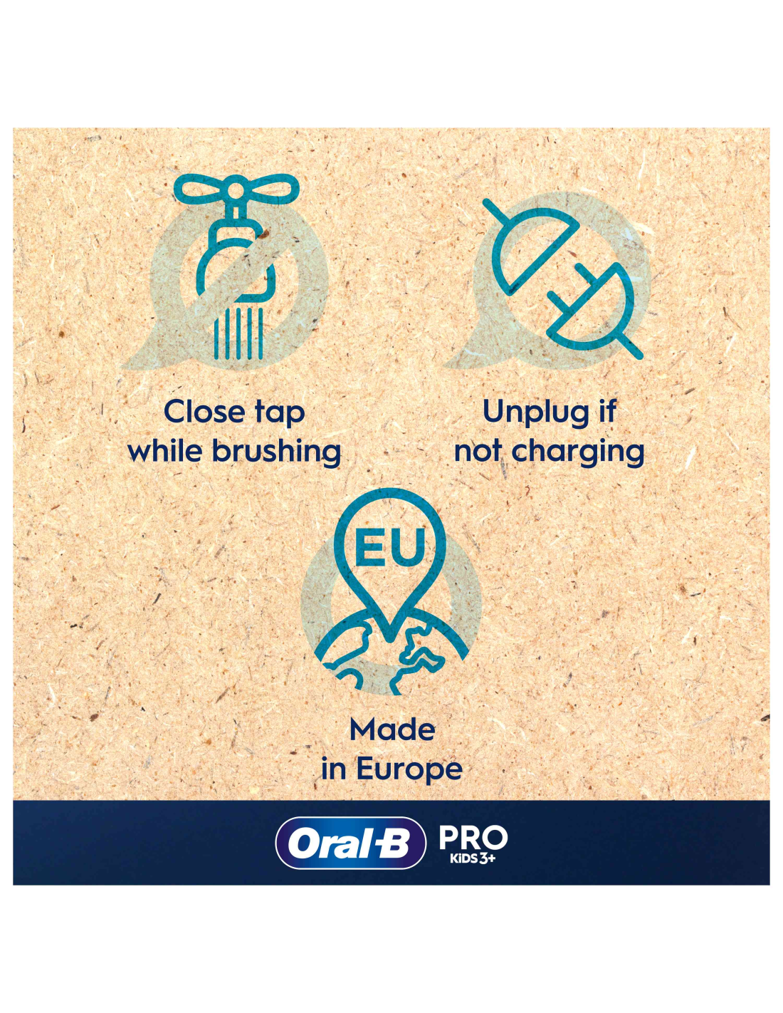 Odontologų rekomenduojamas „Oral-B Pro Kids“ elektrinis dantų šepetėlis vaikams nuo 3 metų valo švelniai ir veiksmingai. Šis dantų šepetėlis turi 2 veikimo režimus, įskaitant unikalų vaikams pritaikytą jautrių dantų valymo režimą. Jis pašalina daugiau dantų apnašų nei paprastas dantų šepetėlis. Su 4 teminiais lipdukais, kuriais galima papuošti kotelį.
