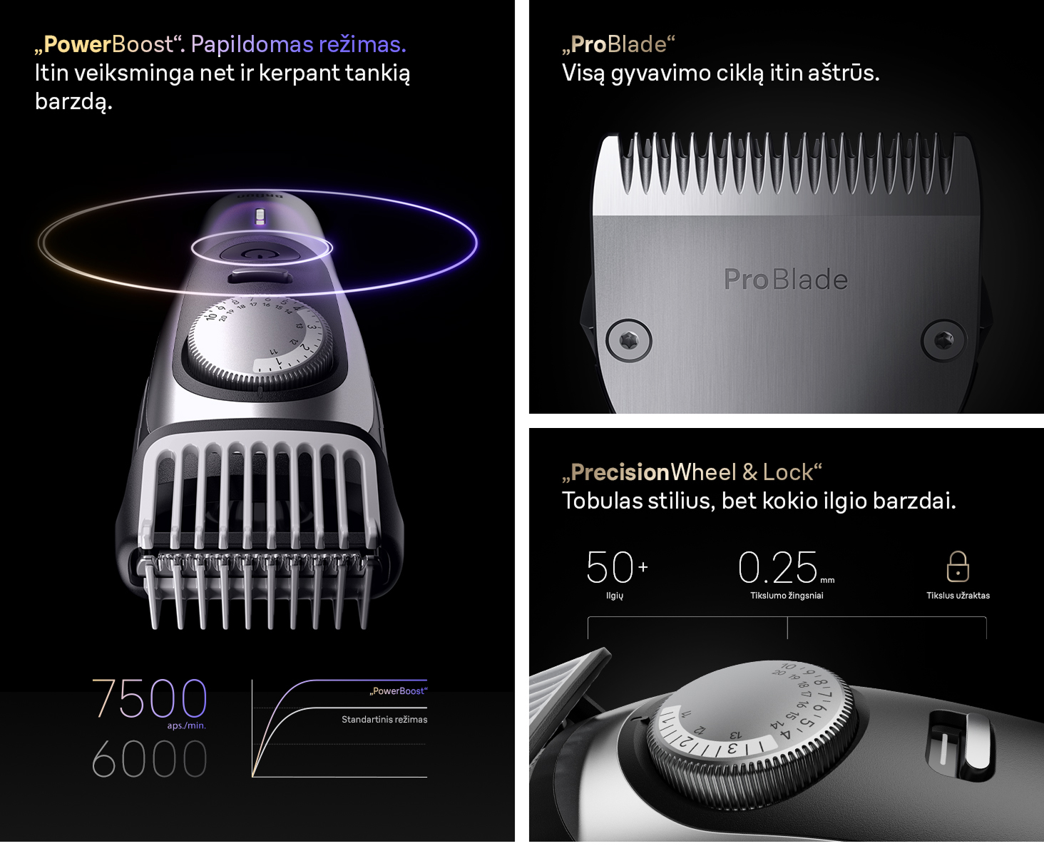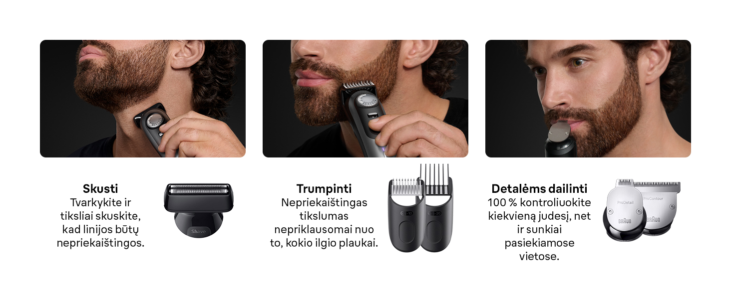 - PrecisionWheel & Lock Tobulas stilius, bet kokio ilgio barzdai. 100 % valdymas, kad nebūtų jokių klaidelių.
