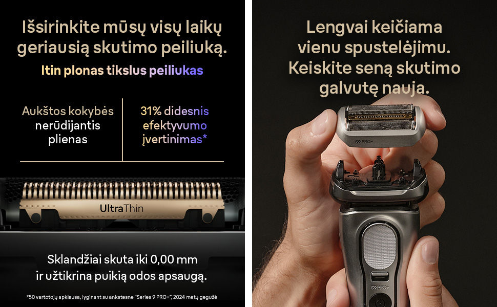 Maksimali odos apsauga: itin ploni preciziniai peiliukai leidžia skustis efektyviau nei su bet kuriuo ankstesniu „Series 9“ elektriniu skustuvu, užtikrindami itin švelnų skutimąsi.
