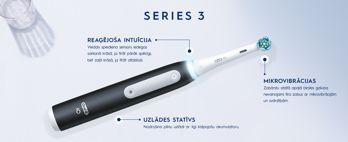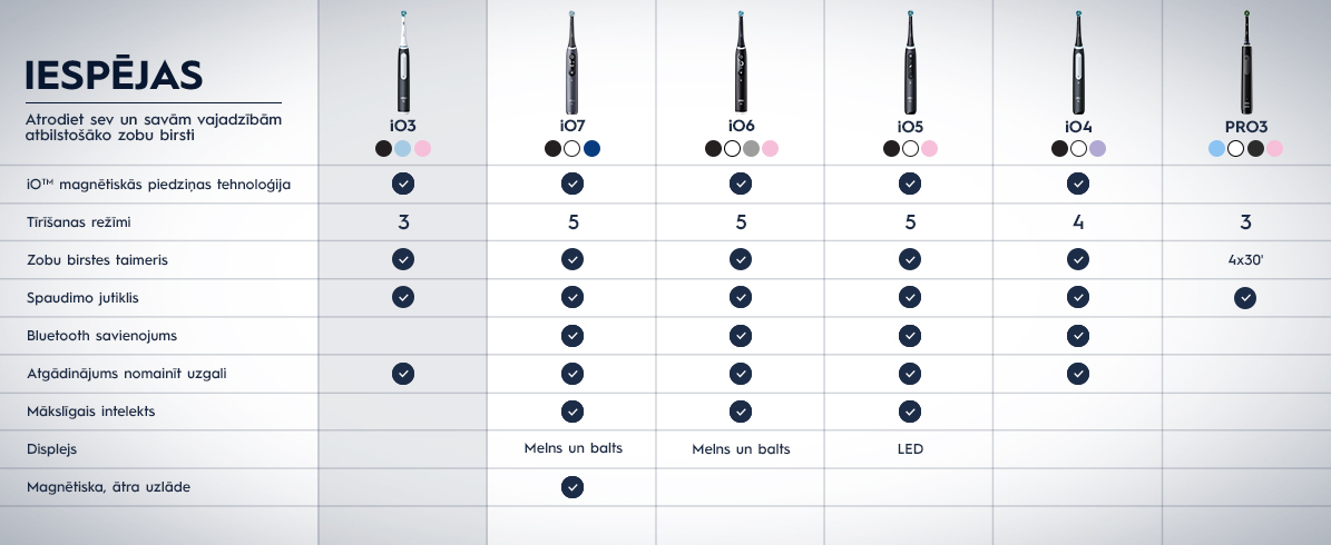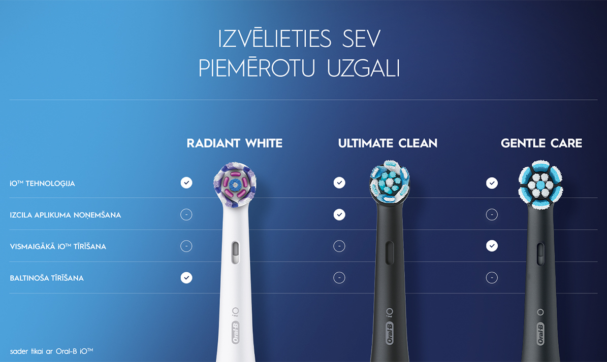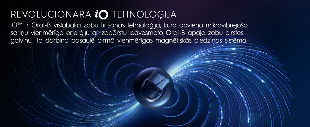 iO™ ir Oral-B vislabākā zobu tīrīšanas tehnoloģija, kura apvieno mikrovibrējošo sariņu vienmērīgo enerģiju ar zobārstu iedvesmoto Oral-B apaļo zobu birstes galviņu. To darbina pasaulē pirmā vienmērīgas magnētiskās piedziņas sistēma.