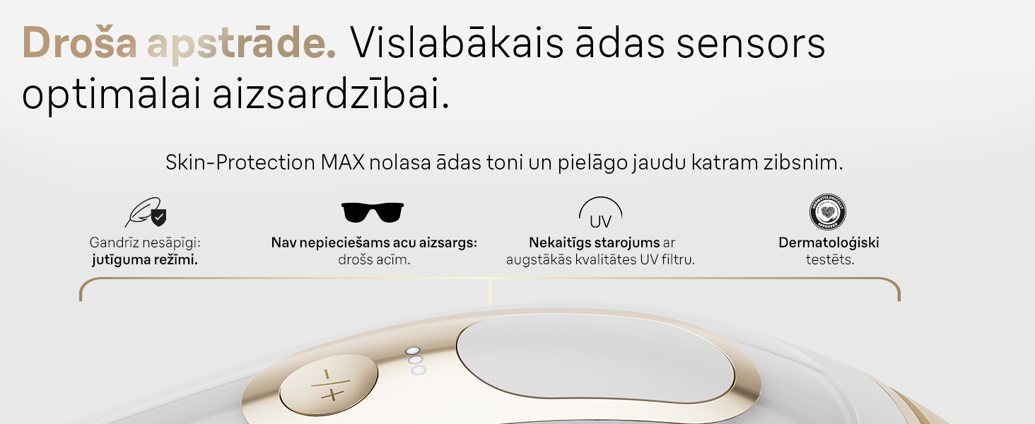 ● Saudzīga iedarbība pret ādu, pateicoties trim jutīgajiem režīmiem, kas samazina gaismas intensitāti, lai saudzīgāk koptu jutīgas zonas, piemēram, seju, paduses vai intīmās zonas