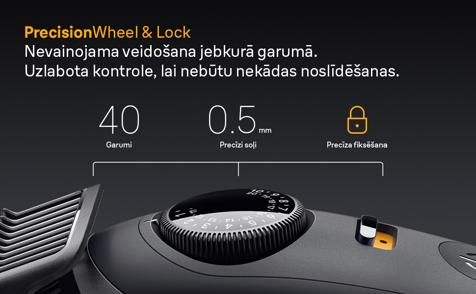 - PrecisionWheel & Lock Nevainojama veidošana jebkurā garumā. Uzlabota kontrole, lai nebūtu nekādas noslīdēšanas
