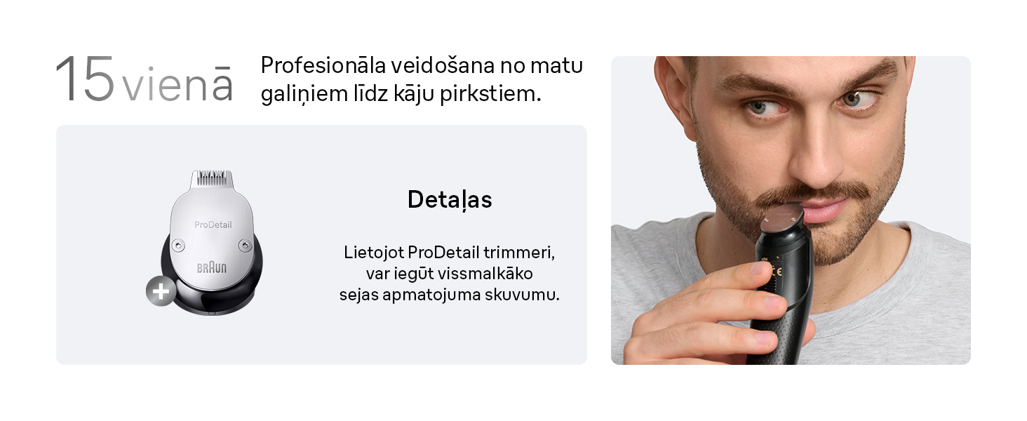 - Detaļas Lietojot ProDetail trimmeri, var iegūt vissmalkāko sejas apmatojuma skuvumu.