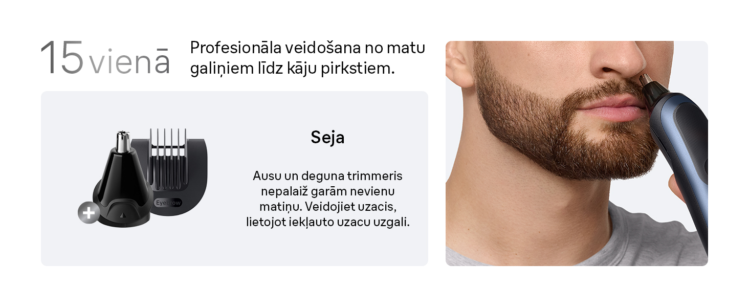 - Seja Ausu un deguna trimmeris nepalaiž garām nevienu matiņu. Veidojiet uzacis, lietojot iekļauto uzacu uzgali.