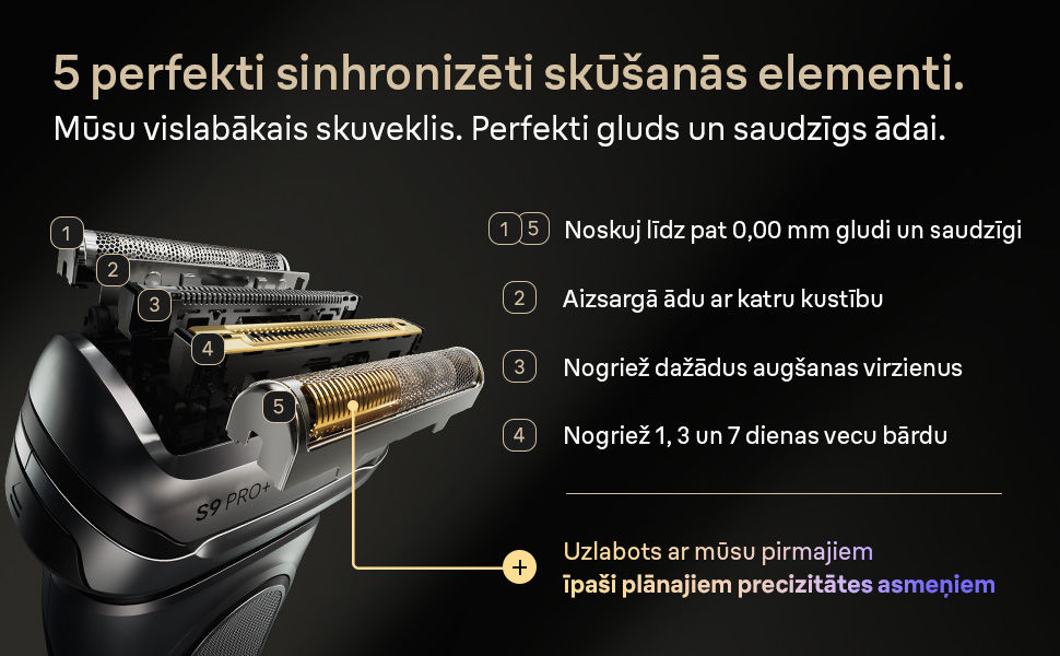 Perfekta skūšanās līdz 0,00 mm: 5+1 perfekti sinhronizēti skūšanās elementi maigi nogriež pat visbiezāko bārdu ar katru vilcienu.