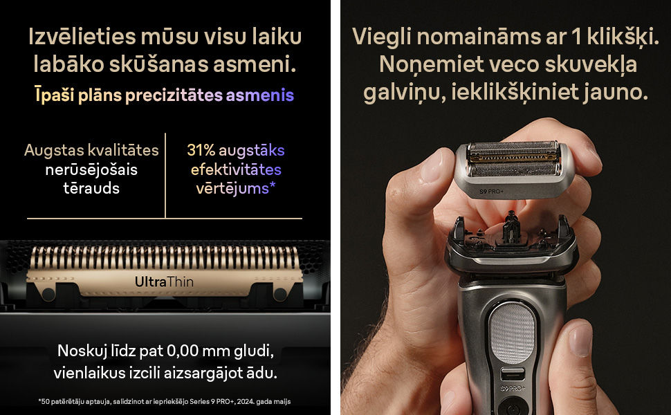 Pārej uz mūsu vismodernāko skuvekļa galviņu: saderīga ar visām Series 9 skuvekļu paaudzēm. Viegli nomaināma tikai ar vienu klikšķi.