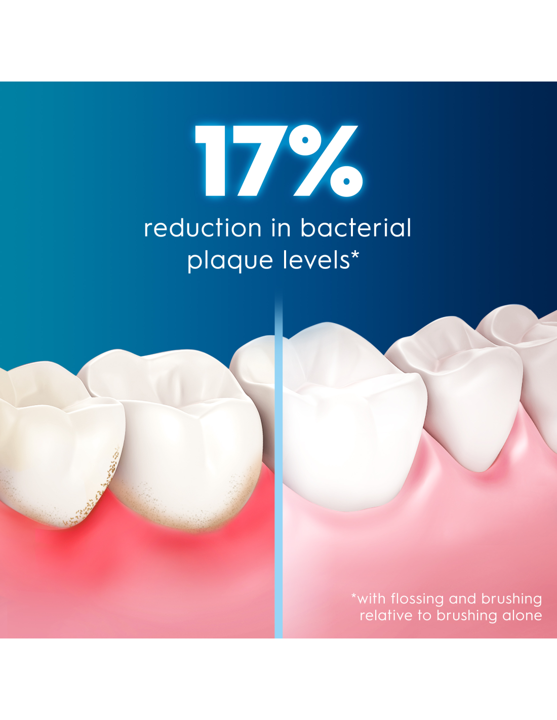 Zobu tīrīšana pati par sevi neietekmēs visas grūti sasniedzamās vietas, kur veidojas aplikums. Tas ir iespējams ar Oral B Thread Essential Waxed Mint. Viegli vaskots, šis plīsumiem izturīgais, teksturētais zobu diegs bez piepūles slīd starp zobiem un zem smaganu līnijas. Tas palīdz noņemt grūti sasniedzamu plāksni.